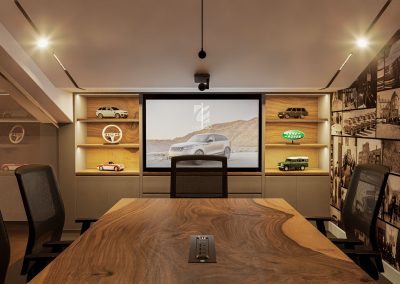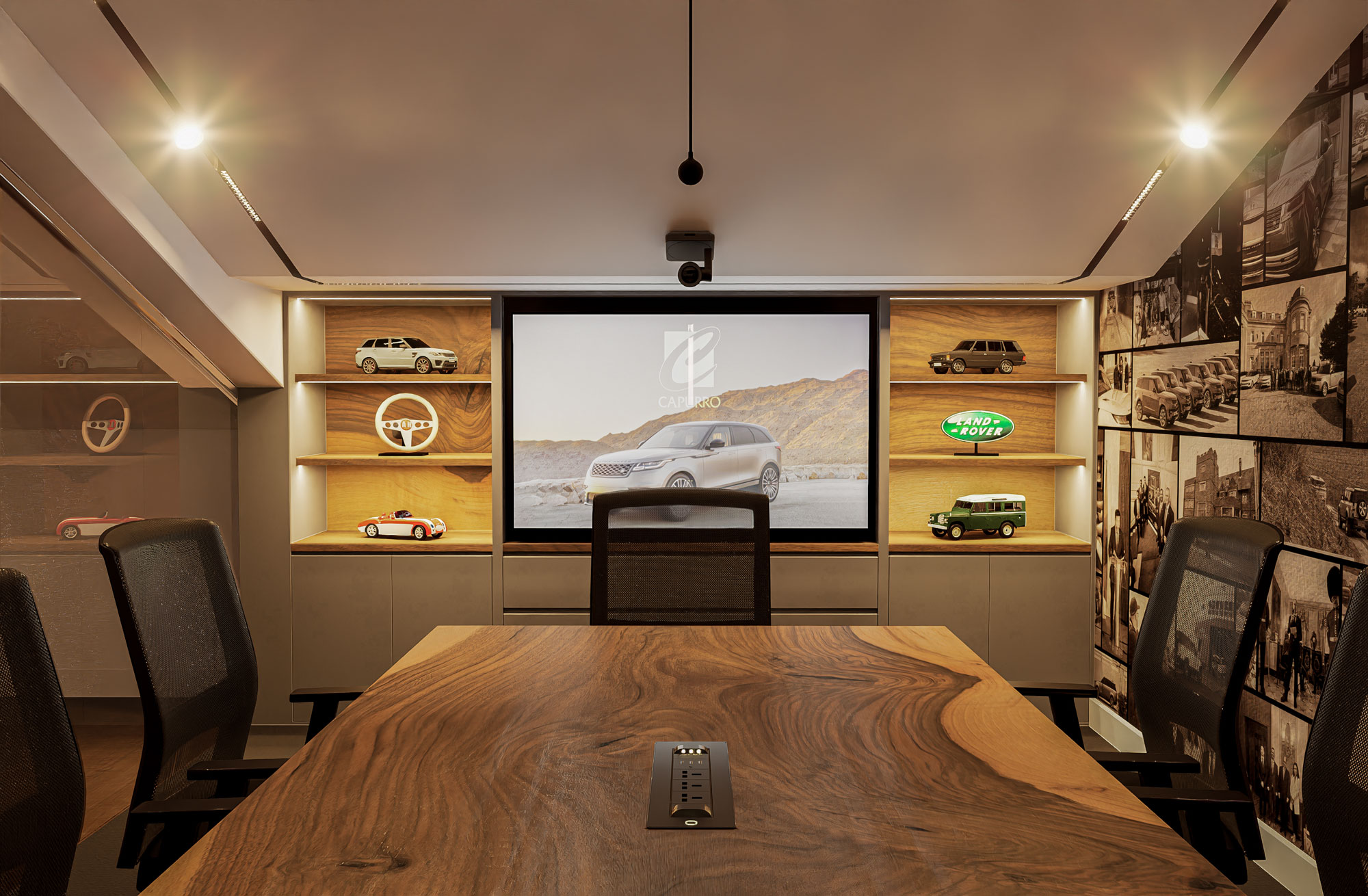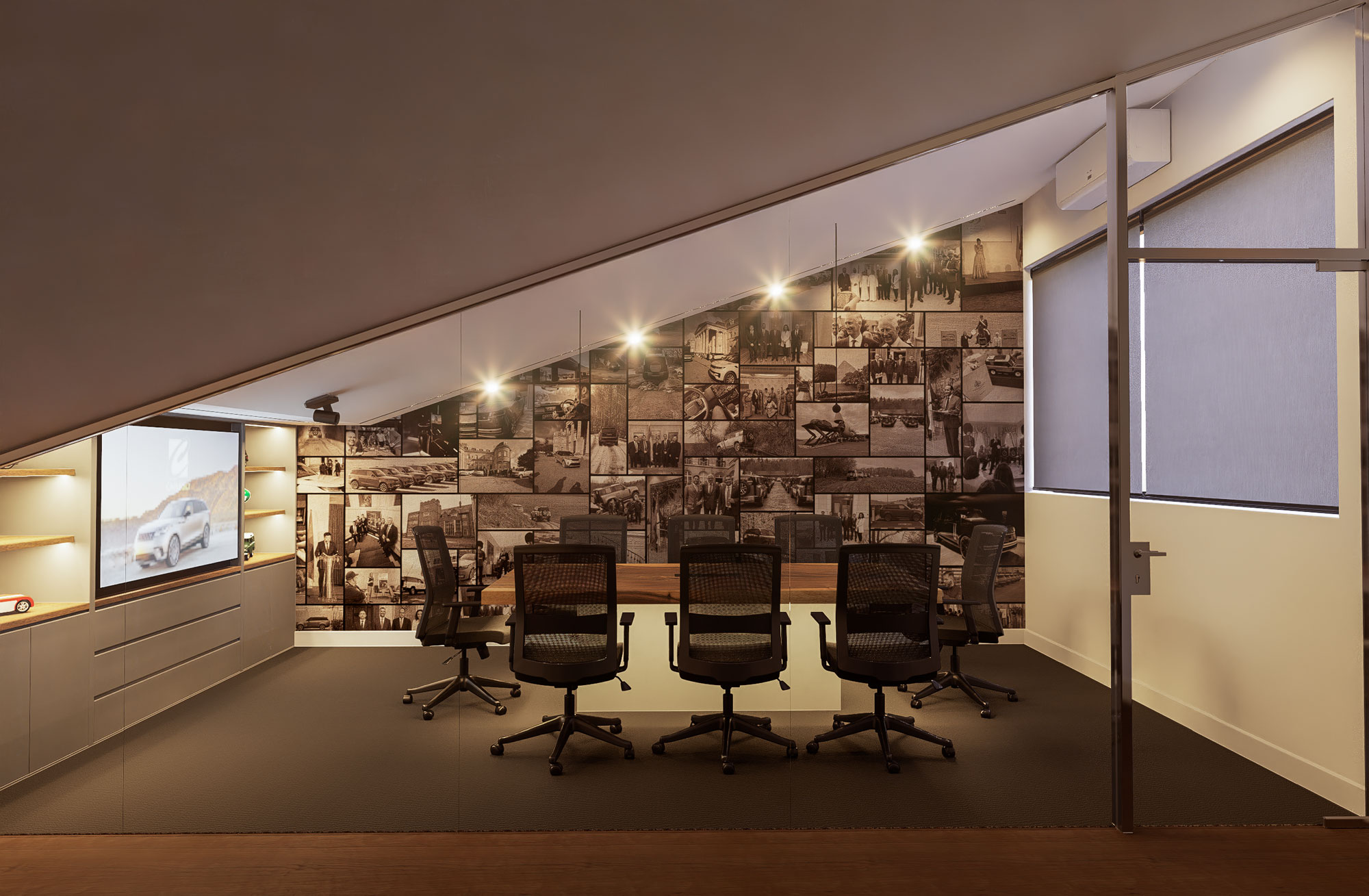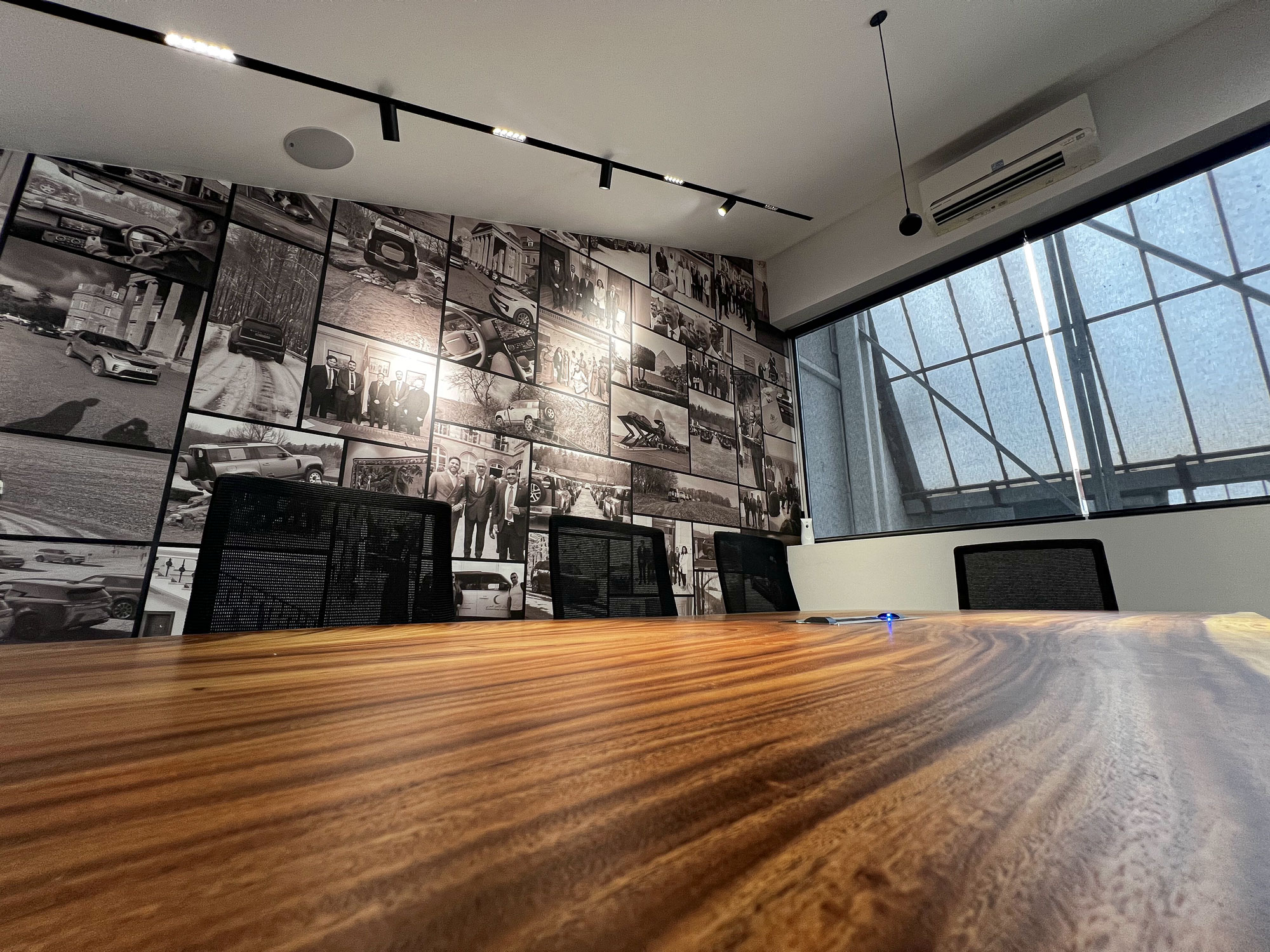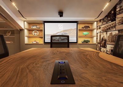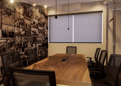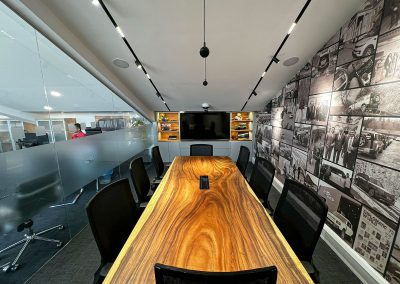 For our recent project, we integrated advanced technology solutions to create an innovative meeting space. Central to this is a professional videoconferencing system with high-end equipment, ensuring the best communication experience. We also incorporated smart glass to provide privacy to the room when needed. Complementing the technological features, we designed bespoke furniture and a conference table made from Samán wood from Indonesia, adding a unique and premium aesthetic to the space. As a final touch, we decorated the environment with wallpaper featuring photographs from various trips taken by the company’s representatives, capturing key moments when international agreements were made. This project seamlessly combines advanced technology with thoughtful design, reflecting the company’s global identity.