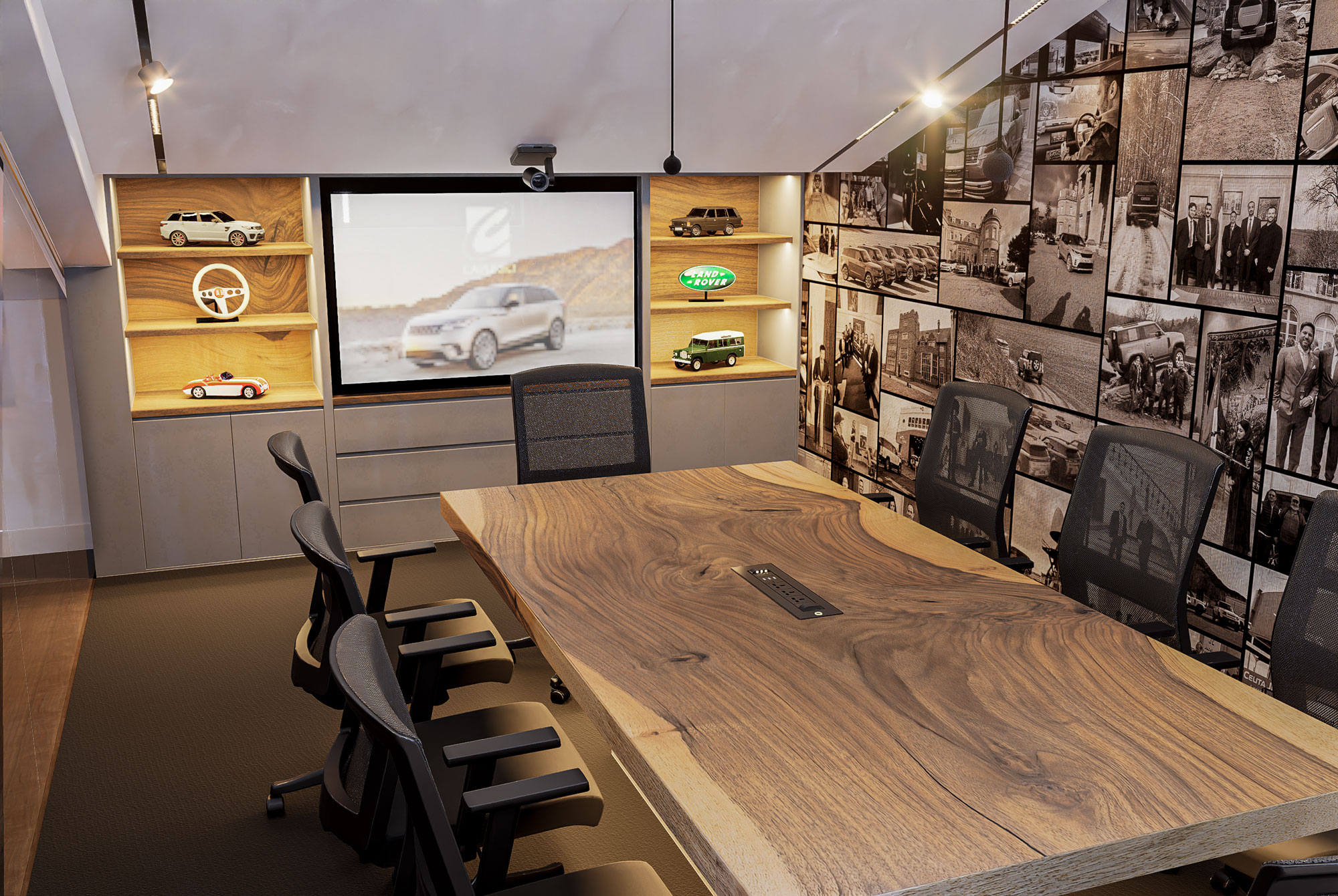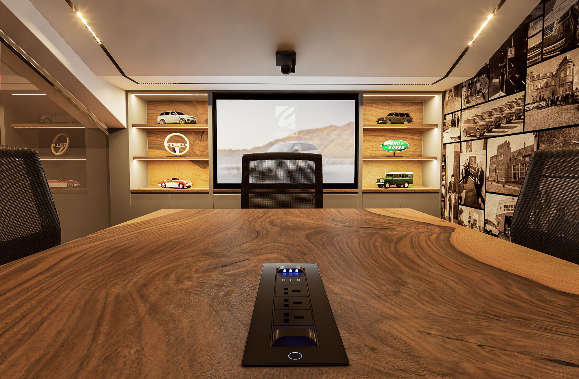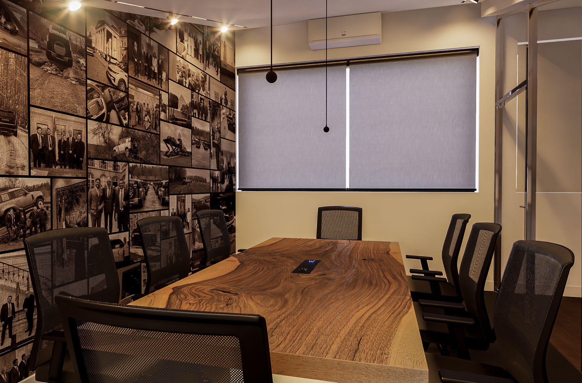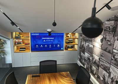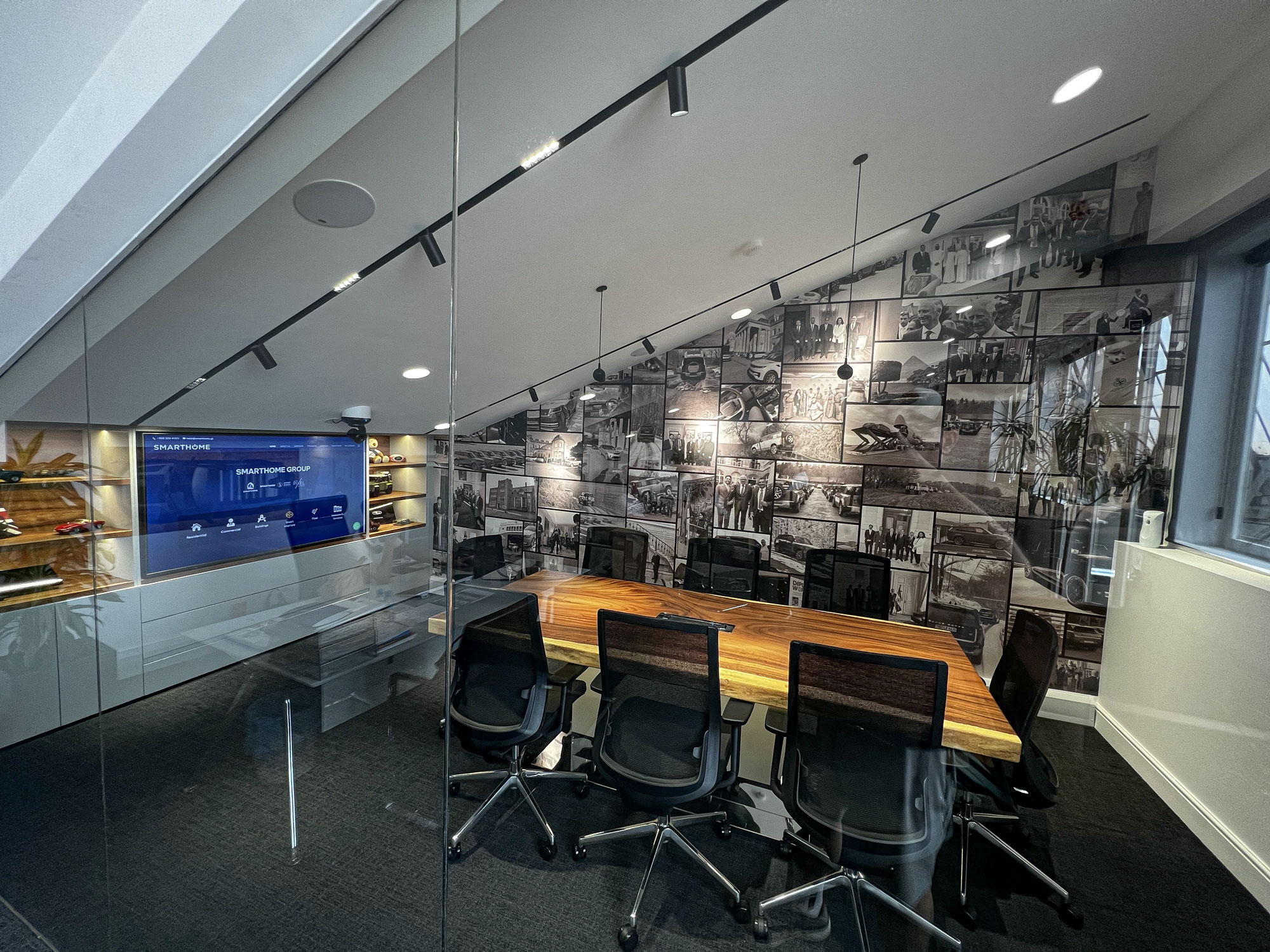 For our recent project, we integrated advanced technology solutions to create an innovative meeting space. Central to this is a professional videoconferencing system with high-end equipment, ensuring the best communication experience. We also incorporated smart glass to provide privacy to the room when needed. Complementing the technological features, we designed bespoke furniture and a conference table made from Samán wood from Indonesia, adding a unique and premium aesthetic to the space. As a final touch, we decorated the environment with wallpaper featuring photographs from various trips taken by the company’s representatives, capturing key moments when international agreements were made. This project seamlessly combines advanced technology with thoughtful design, reflecting the company’s global identity.