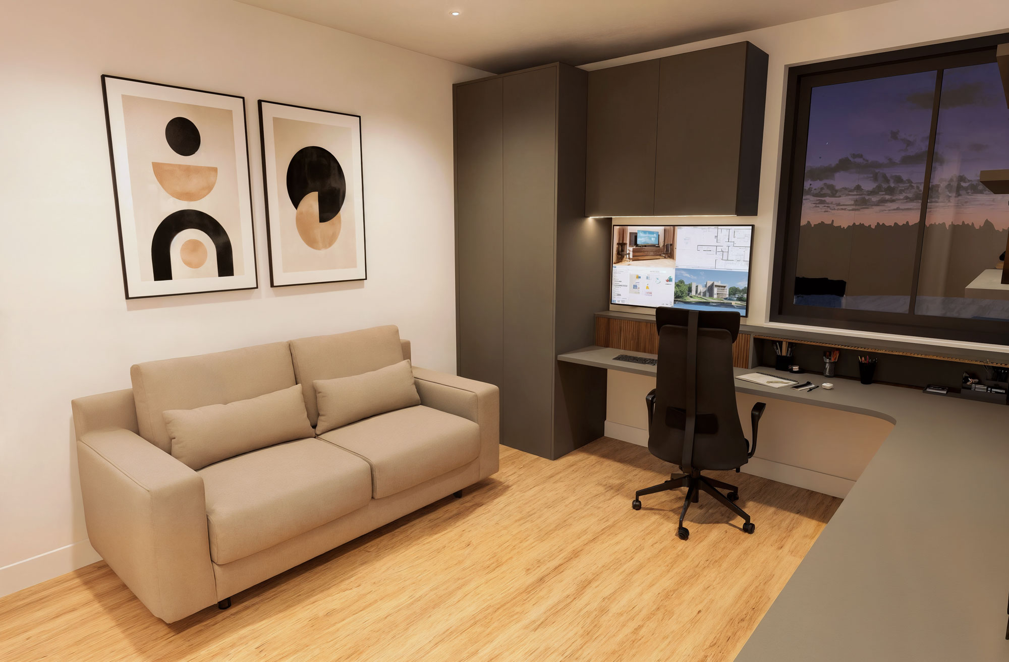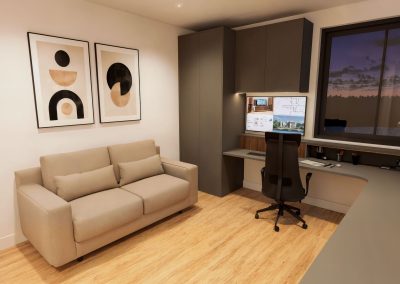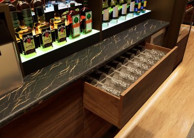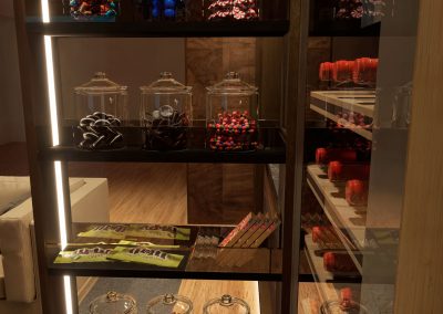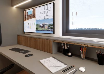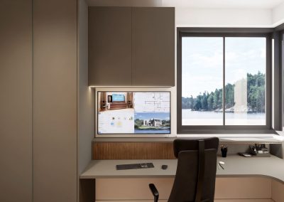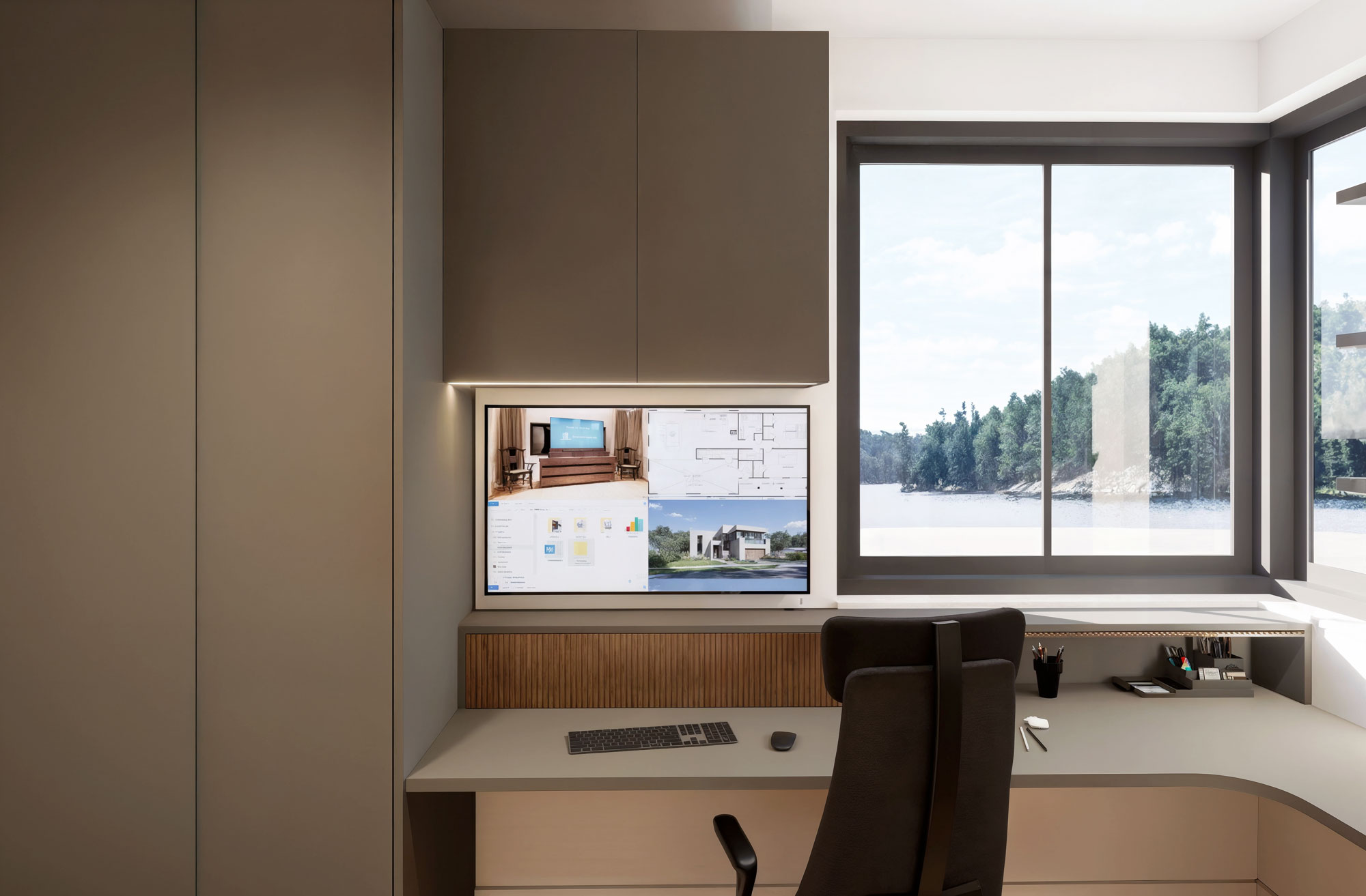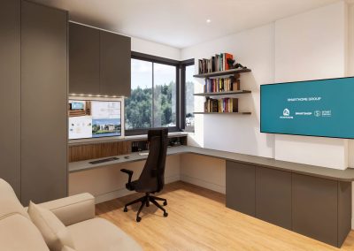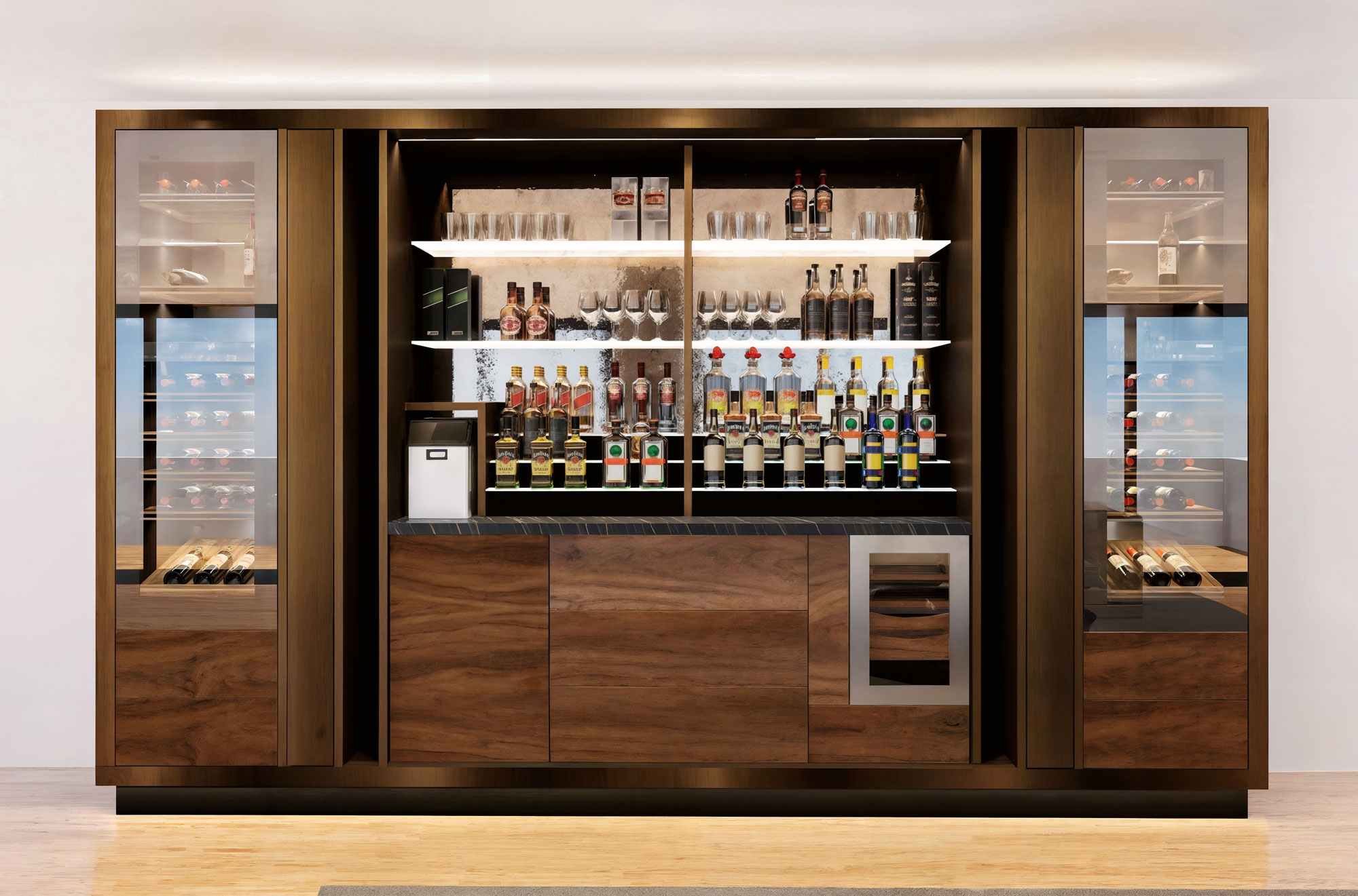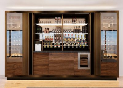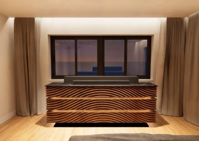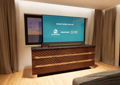 The bar cabinet includes dual wine fridges, a built-in humidor for cigars and cigarillos, an ice maker, and RGBW LED-lit shelving to enhance display and mood. A concealed home office allows seamless transition from work to leisure, while the bedroom features a motorised TV cabinet and matching bedside tables. Every element blends innovation with refined design.