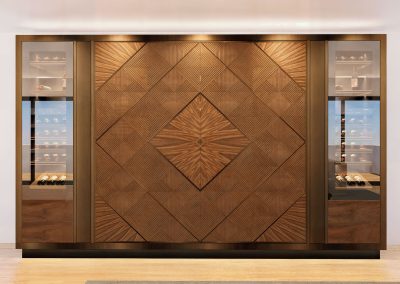 The living room features a wall-mounted unit designed to accommodate the market’s largest OLED TV, crafted in brushed bronze, crown cut American walnut, and natural stone, with integrated indirect lighting for ambient depth.